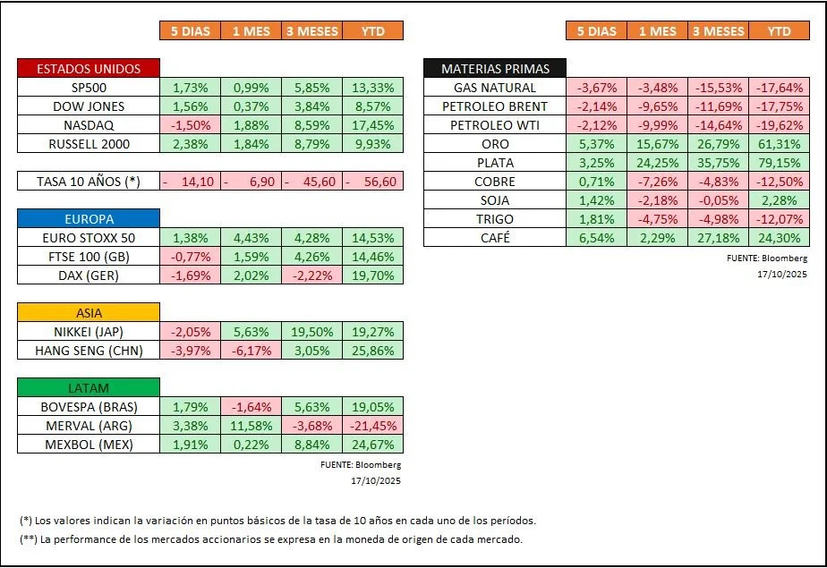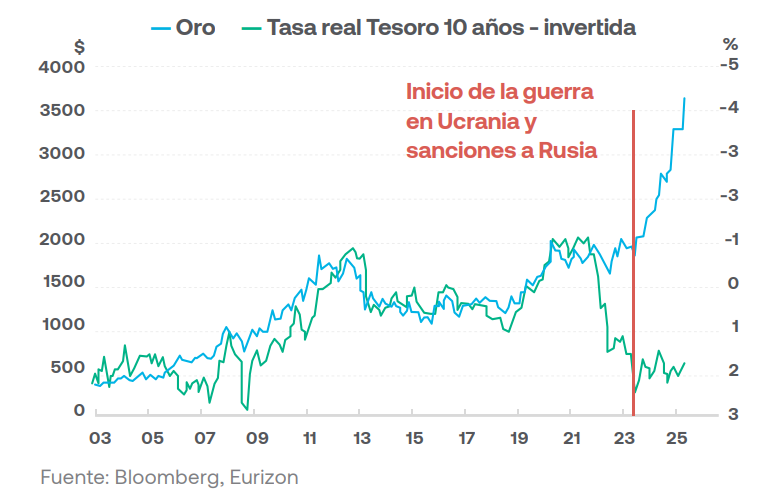 La gráfica de esta semana muestra cómo el Oro continúa superando máximos históricos y es por eso que esta semana nos parece interesante compartirles dos gráficas referidas al tema. La primer gráfica muestra cómo el precio del oro ha aumentado mientras las tasas reales del Tesoro estadounidense a 10 años (ajustadas por inflación) han caído. Según explican los analistas, esta relación inversa refleja una pérdida de confianza en las monedas emitidas por los bancos centrales, especialmente después de años de políticas expansivas y deuda creciente. La tendencia no comenzó con Trump ni depende de factores políticos inmediatos: es más bien una consecuencia de la desconfianza estructural en los sistemas monetarios tradicionales y la búsqueda de activos que no dependan de la emisión de gobiernos. La segunda gráfica ilustra cómo los bancos centrales del mundo han ido reemplazando progresivamente sus reservas en dólares o euros por oro. Hoy el oro ya representa cerca del 20 % de las reservas internacionales (excluyendo EE. UU.), superando al euro (16 %) y quedando solo detrás del dólar (46 %). Los analistas interpretan que esta tendencia refleja un cambio profundo en la estructura del sistema financiero global, donde el oro se consolida como activo de reserva alternativo frente a la inestabilidad de las monedas fiduciarias. En conjunto, ambas gráficas refuerzan la visión de que el mercado del oro no está impulsado solo por factores coyunturales, sino por una transformación estructural: los bancos centrales y los inversores institucionales están reduciendo su exposición al dinero fiduciario y buscando refugio en un activo que perciben como más neutral y duradero. Los analistas concluyen que, de continuar esta tendencia, el oro podría incluso superar al dólar como principal activo de reserva en la próxima década.