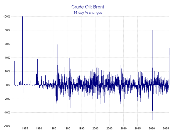 En la gráfica de esta semana se muestran los cambios porcentuales del precio del petróleo Brent en períodos de 14 días desde el año 1970 a la fecha.